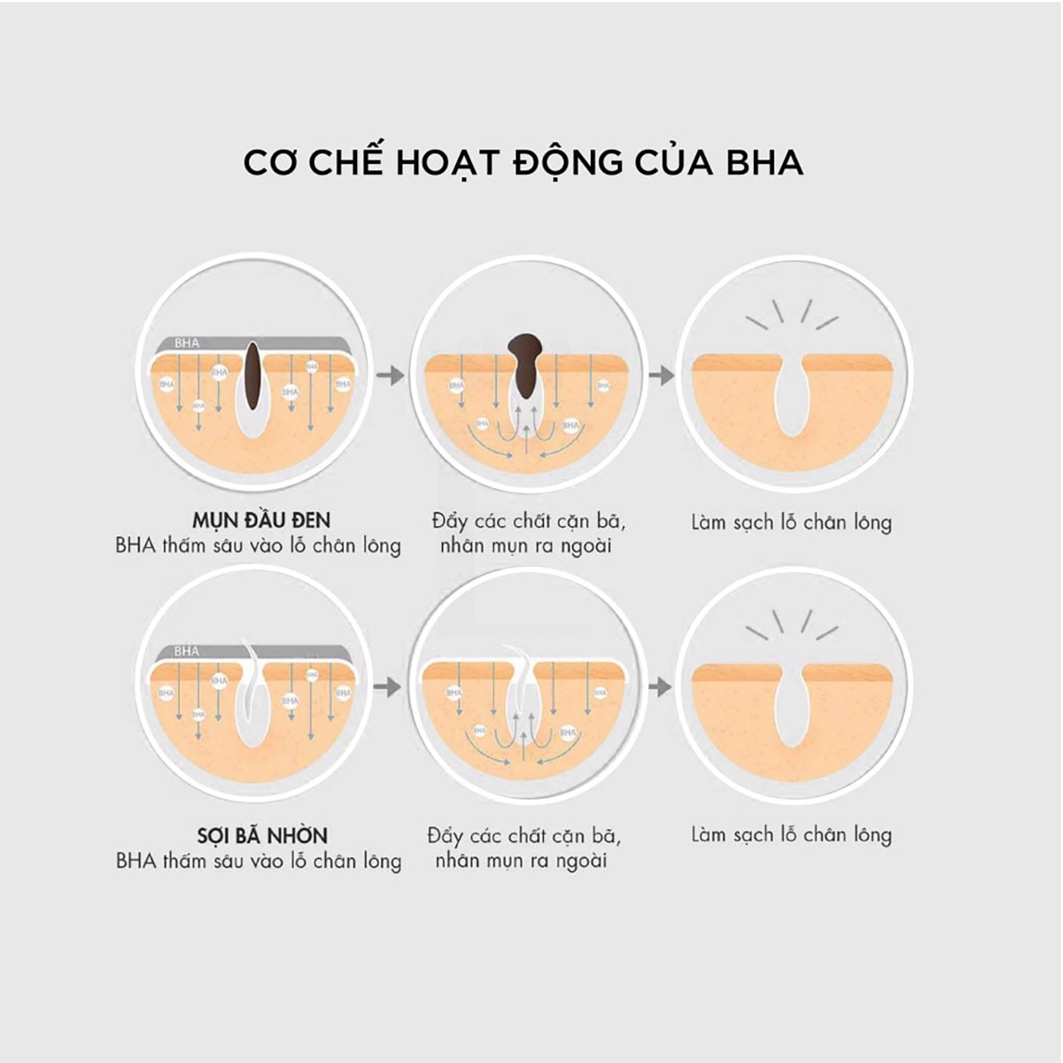 Không như những sản phẩm tẩy tế bào chết cơ học thông thường, BHA hoạt động phá vỡ lớp cấu trúc bề mặt trên cùng của lớp sừng, từ đó loại bỏ các tế bào chết hoặc bị thương tổn, thúc đẩy da sản sinh tế bào mới. Do vậy BHA ngoài trị mụn, còn giữ cho da sạch sâu và do đó giúp hạn chế những tác nhân do mụn và da không sạch như thâm, nám, lỗ chân lông to.