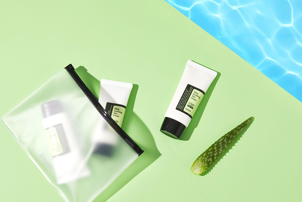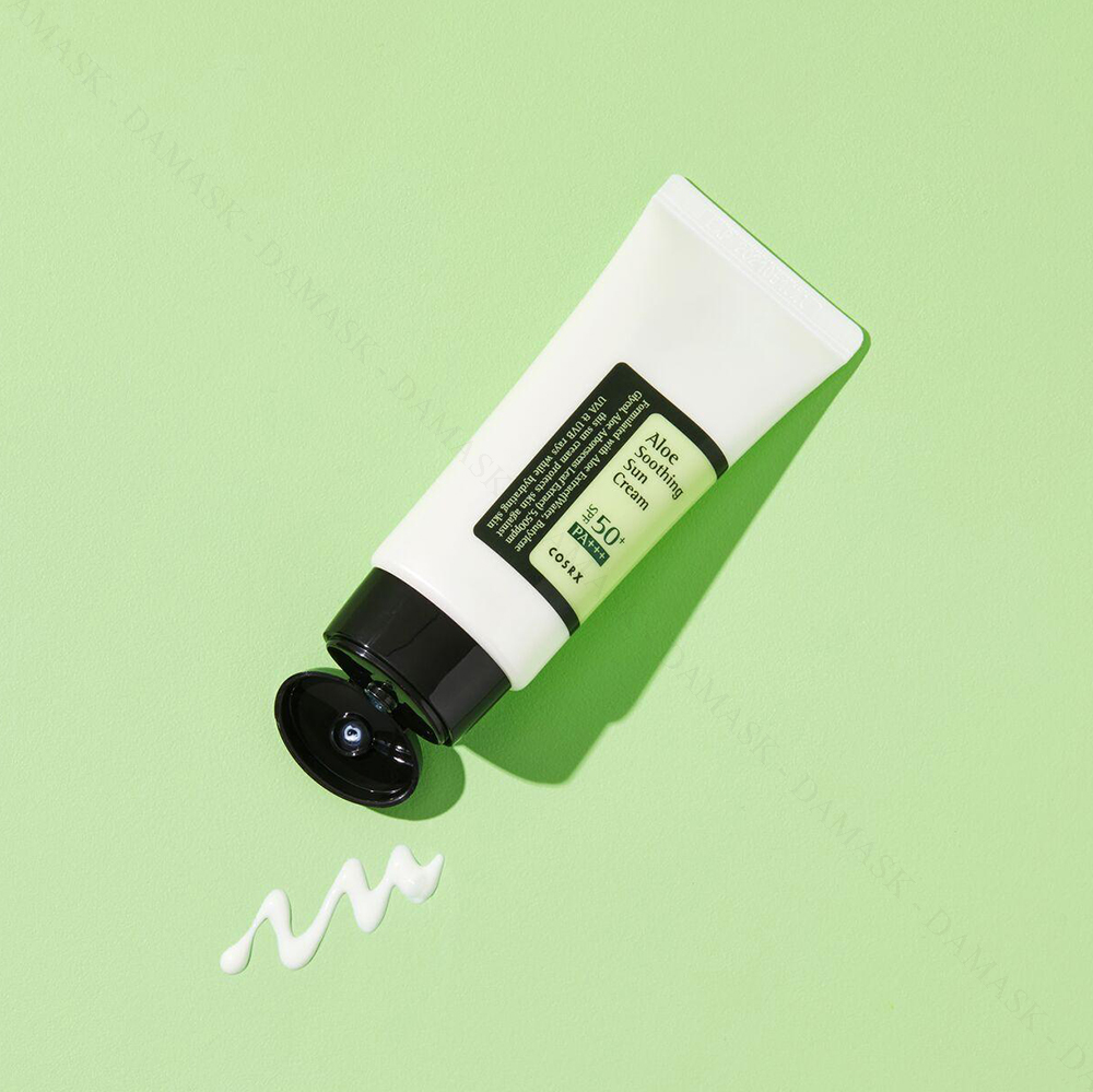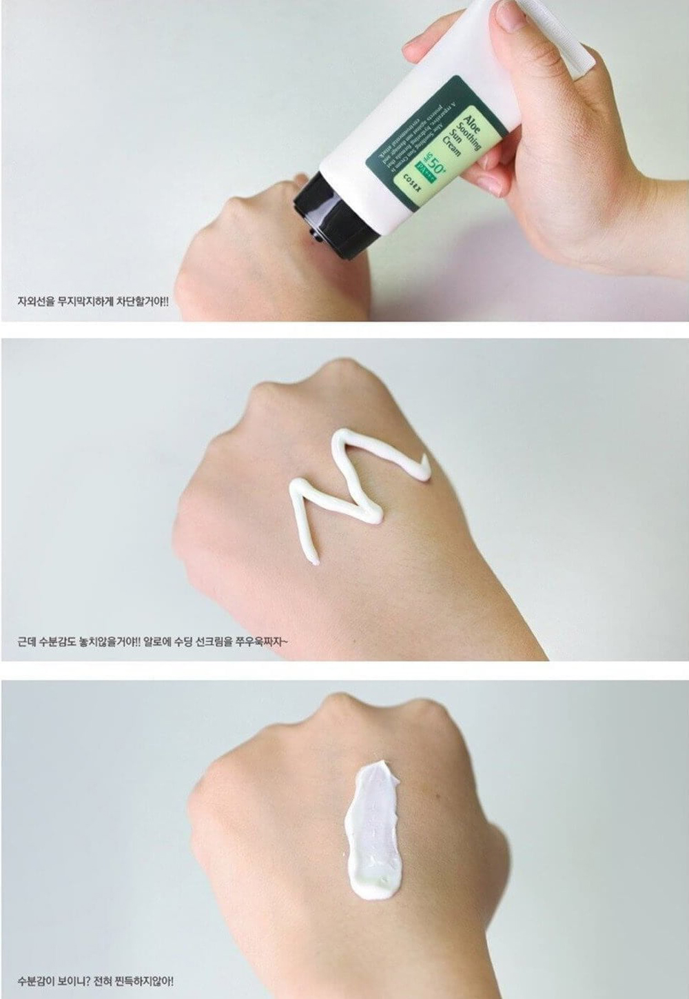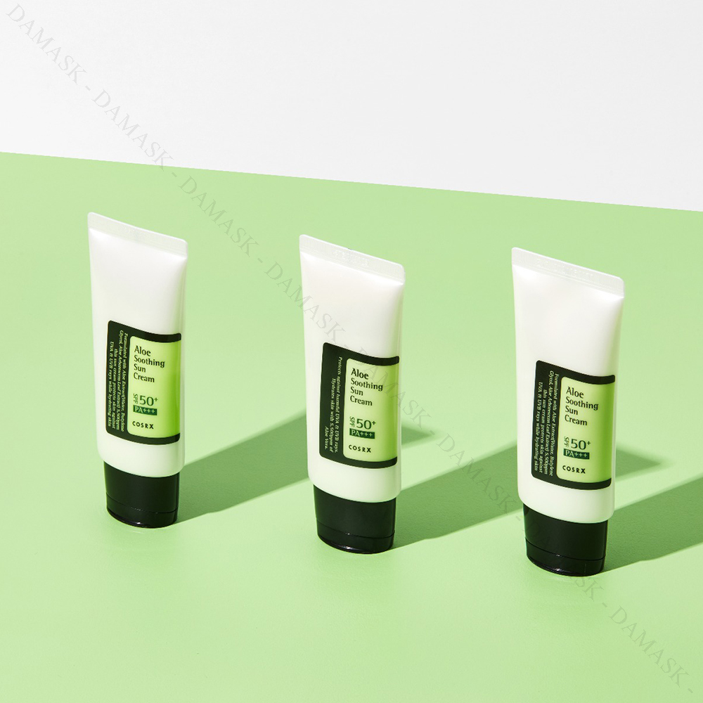 Kem chống nắng COSRX Aloe Soothing Sun Cream được thiết kế dạng tuýp nhựa màu trắng cho cảm giác chắc chắn khi cầm. Phần trên thân, các thông tin về thương hiệu, tên sản phẩm, thành phần, công dụng chính được đóng khung màu xanh trông cực kì nổi bật.