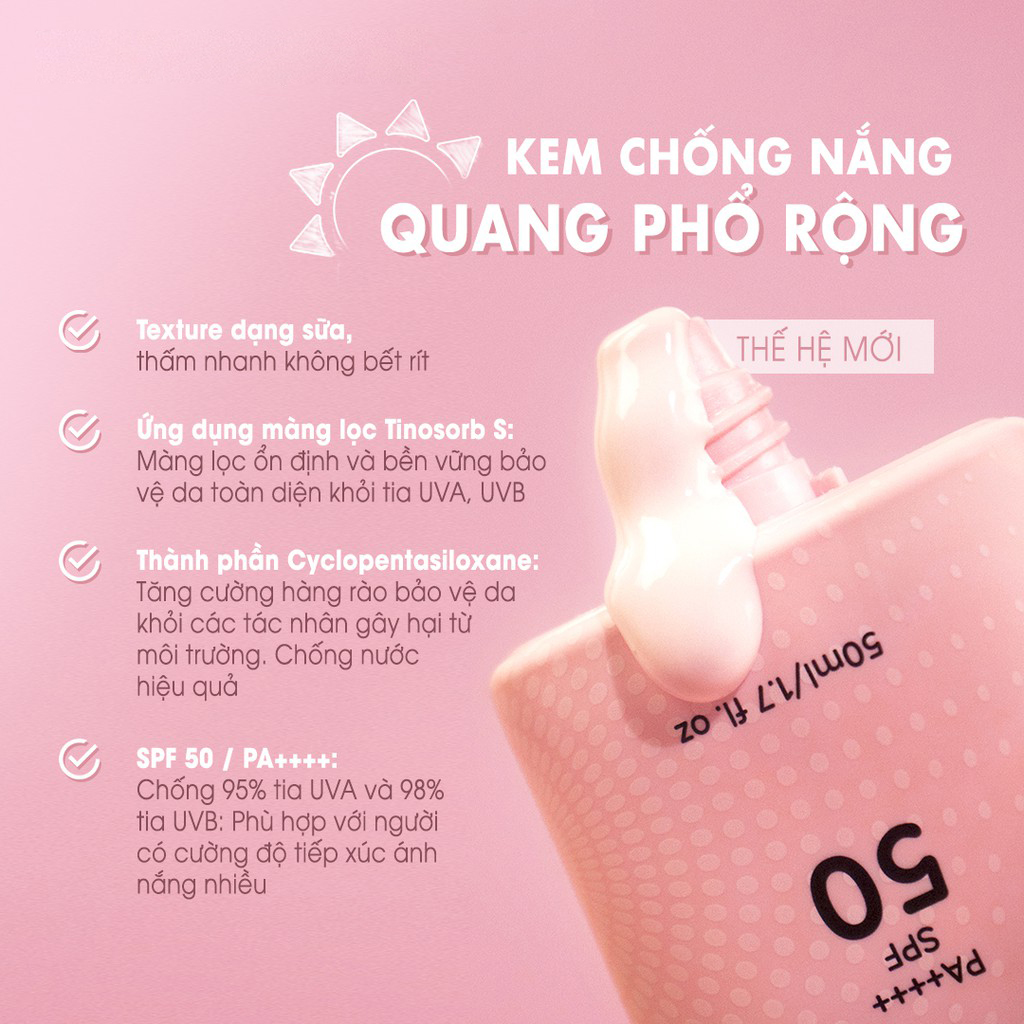 - Mang ưu điểm của 2 dòng kem chống nắng vật lý & hóa học nhờ ứng dụng màng lọc Tinosorb S bền vững và ổn định, vừa hấp thụ và vừa khuếch tán tia UV, bảo vệ da khỏi UVA1, UVA2 và UVB.