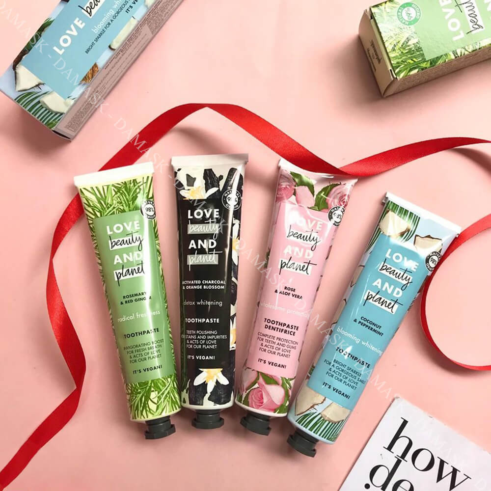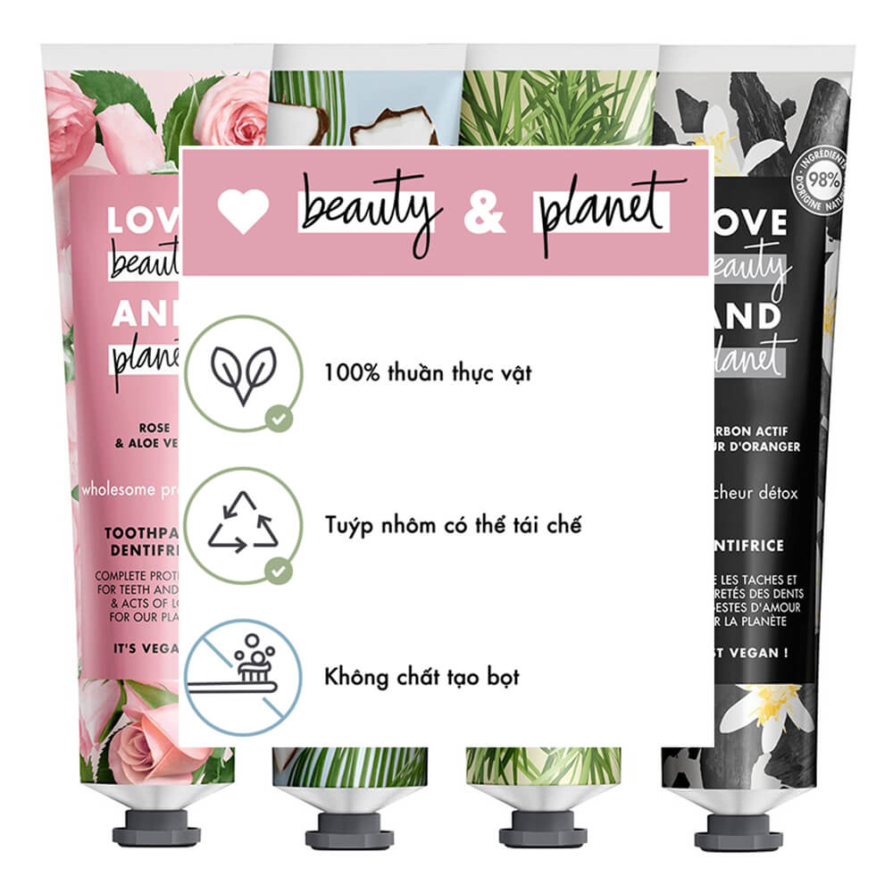 Kem Đánh Răng Love Beauty & Planet Toothpaste có bao bì hộp từ giấy tái chế cùng dạng tuýp nhôm tiện lợi và bảo vệ môi trường. Chiết xuất đến 98% là những thành phần đến từ thiên nhiên. Không chứa những chất độc hại nên hàm răng nhạy cảm nhất đều có thể yên tâm sử dụng.