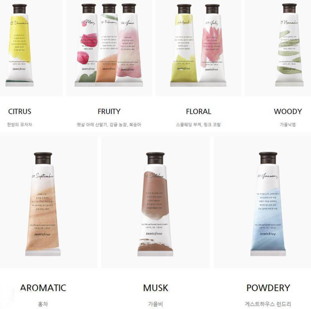 Kem dưỡng da tay Innisfree Jeju Life Perfumed Hand Cream mang đến hương nước hoa dịu nhẹ cho đôi bàn tay của chị em phụ nữ phải tiếp xúc nhiều với các chất tẩy rửa. Đây là một trong những dòng sản phẩm chuyên biệt chăm sóc da tay được thương hiệu Innisfree chăm chút cùng 10 mùi hương khác nhau dành cho 10 tháng trong năm.