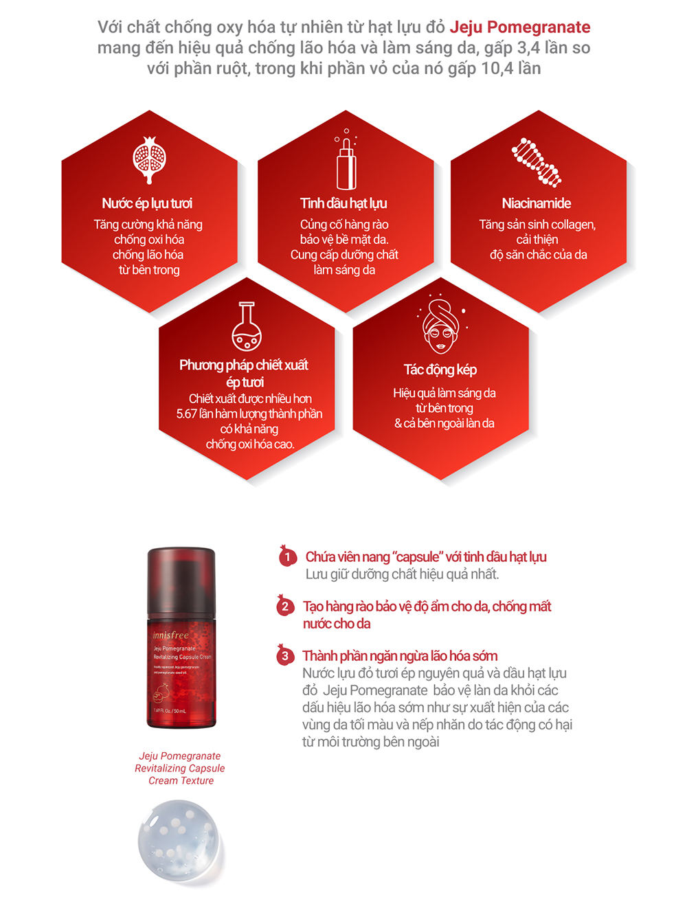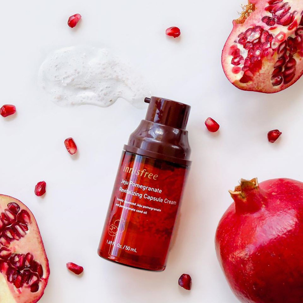 Jeju Pomegranate Revitalizing – dòng sản phẩm có thành phần từ Lựu hữu cơ Jeju giúp bảo vệ và duy trì sức khoẻ của da khỏi các tác động bên ngoài và sự lão hoá từ bên trong. Kem dưỡng Innisfree Jeju Pomegranate Revitalizing Capsule Cream 50ml cung cấp độ ẩm và dưỡng chất dồi dào, bảo vệ và ngăn ngừa lão hóa sớm mang lại vẻ sáng trong rạng rỡ cho làn da.