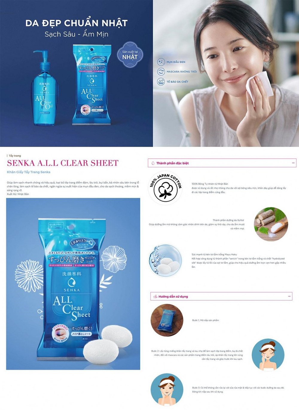 Tẩy trang dường như đã trở nên quen thuộc và là công đoạn không thể thiếu đối với các cô nàng. Nếu bạn bận rộn với quá nhiều công việc thường ngày và không có thời gian chăm sóc da nhiều, vậy thì ít ra hãy chọn cho mình một sản phẩm làm sạch da hiệu quả và an toàn, đồng thời cũng thật nhanh chóng và tiện lợi để sử dụng. Đó chính là Khăn Giấy Tẩy Trang SENKA Cleansing Sheet!