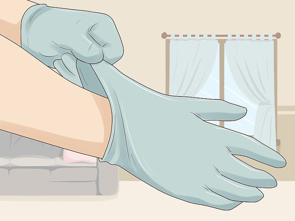 Đeo bao tay latex hoặc nhựa. Nếu bạn mua một hộp thuốc nhuộm, trong hộp thường sẽ có sẵn bao tay. Hãy đeo bao tay trước khi bạn bắt đầu khuấy màu nhuộm và kem trợ nhuộm để bảo vệ da khỏi hóa chất.