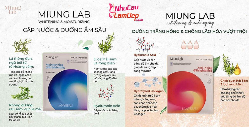 Đây là 1 sản phẩm được sản xuất bởi Công ty TNHH Thương mại dịch vụ LÁNY BEAUTY Việt Nam. Mỹ phẩm được sản xuất hoàn toàn theo công nghệ của Hàn Quốc. Vì vậy mà sản phẩm có chất lượng không thua kém gì so với các loại mặt nạ dưỡng da Hàn Quốc. Sản phẩm mặt nạ Miung Lab hiện đang có tất cả 2 loại: Moisturizing & Brightening (thiết kế bao bì màu trắng và xanh) và Anti-Aging & Brightening (thiết kế bao bì trắng và cam). Mỗi loại sẽ có 1 công dụng và bảng thành phần khác nhau phù hợp với nhu cầu dưỡng da của từng người. Cụ thể sẽ là: