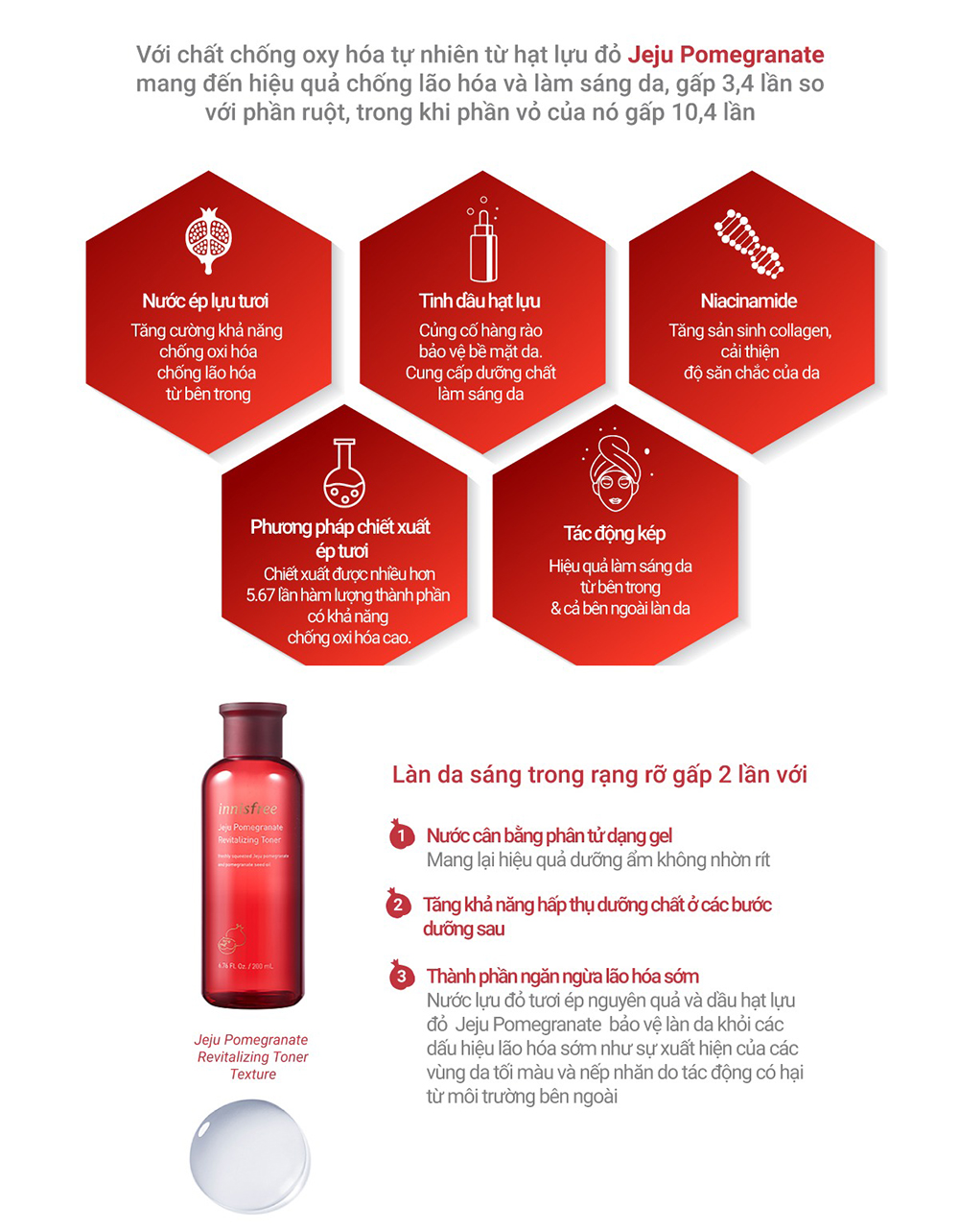 Nếu bạn đang cần tìm một loại toner làm sáng da và ngăn ngừa các dấu hiệu lão hóa thì Damask xin giới thiệu với bạn một loại nước cân bằng đến từ thương hiệu Innisfree đó chính là nước hoa hồng chiết xuất lựu đỏ Jeju Pomegranate Revitalizing Toner. Lựu đỏ vốn nổi tiếng với đặc tính chống oxy cao, chính vì thế lựu đỏ trở thành nguyên liệu chính để tạo ra một dòng nước cân bằng chống lại các dấu hiệu lão hóa cho da trẻ đẹp và tràn đầy sức sống.