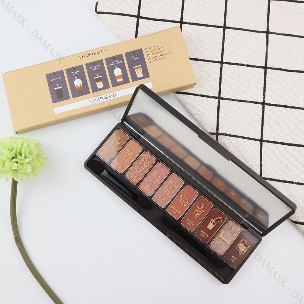 Phấn Mắt Etude House Play Color Eyes In The Cafe bao gồm 10 ô màu với chủ đề In The Cafe được trang trí bởi hình ảnh những hạt cà phê trông vô cùng bắt mắt. Tông chủ đạo của sản phẩm là màu nâu cà phê, mỗi màu sắc sẽ tượng trưng cho một tách cà phê thơm ngon, đầy hấp dẫn. Các tông màu được trải dài từ màu nâu đậm như tách cà phê đậm đặc đến những màu nâu nhạt hơn như những tách cà phê sữa ngọt ngào đầy mê hoặc sẽ mang đến cho đôi mắt bạn những sắc thái độc đáo và quyến rũ.