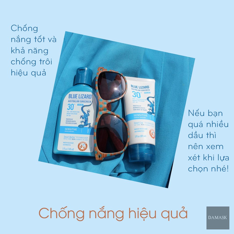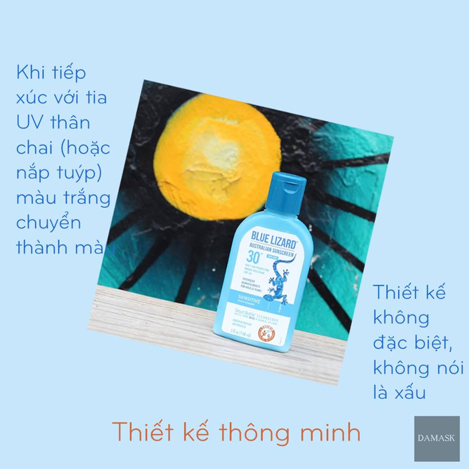 Kem chống nắng Blue Lizard Sensitive được sản xuất từ Úc, Blue Lizard được Eviromental Working Group, một nhóm đãi diện cho người tiêu dùng bầu chọn là một trong những loại kem chống nắng tốt nhất trên thị trường; đây cũng là sản phẩm thường được các bác sĩ nhi và da liễu ưu tiên khuyên dùng. Như vậy đủ biết là ẻm hot thế nào rồi nha. Em này có bao bì xấu thật nha, cơ mà chớ vội coi thường bạn nhé, hẳn là chai sử dụng công nghệ thông minh đấy. Khi sản phẩm tiếp xúc với tia UV thì thân chai (hoặc nắp của tuýp) màu trắng sẽ chuyển thành màu xanh nhé. Vừa là cách cảnh báo là có tia UV rồi đấy, nhớ bôi kem nha bạn, vừa để phân biệt hàng fake nữa, tiện chưa? Đó hẳn là lý do vì sao ẻm có cái tên đặc biệt “Blue Lizard” (thằn lằn xanh) rồi, chuyên gia đổi màu biến hình mà lị.