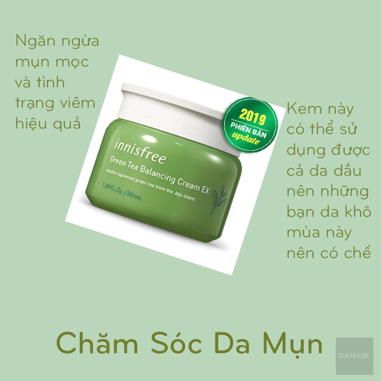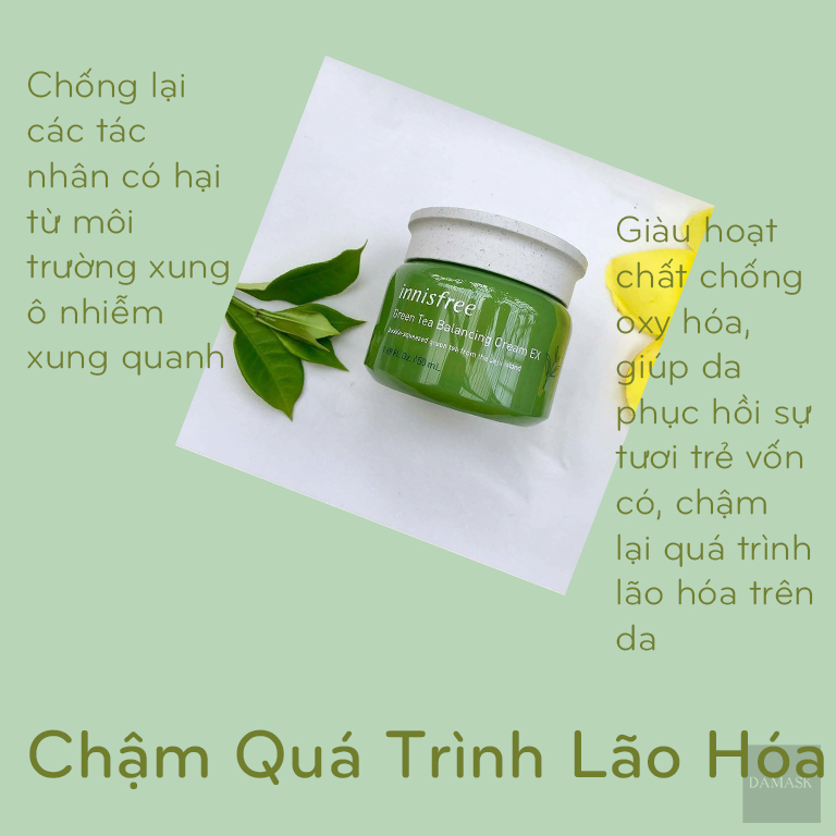 Với sự nổi tiếng về những sản phẩm thiên nhiên an toàn, hãng mỹ phẩm đình đám Innisfree Hàn Quốc luôn chiếm được sự yêu mến đông đảo của tất cả mọi người trong mọi lứa tuổi. Đặc biệt dòng sản phẩm trà xanh xuất hiện từ năm 2007 đến nay vẫn là dòng sản phẩm bán chạy nhất của hãng không chỉ bởi sự an toàn, lành tính mà còn bởi những công dụng đặc biệt nổi trội. Kem dưỡng ẩm trà xanh Green Tea Balancing Cream EX Innisfree ngoài cung cấp độ ẩm cho da, dưỡng da căng mướt ẩm mượt thì ở phiên bản mới nhất 2018, cải tiến và đổi mới từ bao bì đến thành phần bên trong, có khả năng điều chỉnh lượng nước trên da, cân bằng độ pH và dưỡng da căng mướt mịn màng đầy sức sống. Em này thuộc dòng Balancing Cream của nhà Innisfree được nghiên cứu dành riêng cho các nàng da hỗn hợp, những làn da thiếu ẩm, da cần được chăm sóc phục hồi sau mụn hoặc da đang bị mụn nhẹ. 68,89% thành phần tinh chất trà xanh trong sản phẩm giàu hoạt chất chống oxy hóa, giúp da phục hồi sự tươi trẻ vốn có, chậm lại quá trình lão hóa trên da và tăng đề kháng chống lại các tác nhân có hại từ môi trường xung ô nhiễm xung quanh. Bên cạnh đó em này nổi bật với khả năng làm sạch sâu, tái tạo mới làn da, làm sáng và đều màu da, tăng đề kháng giúp da chống lại quá trình oxi hóa tự nhiên, ngăn ngừa mụn mọc và tình trạng viêm hiệu quả. Em này được đánh giá cao bởi kết cấu kem mỏng mịn, dễ thẩm thấu, không bết dính.