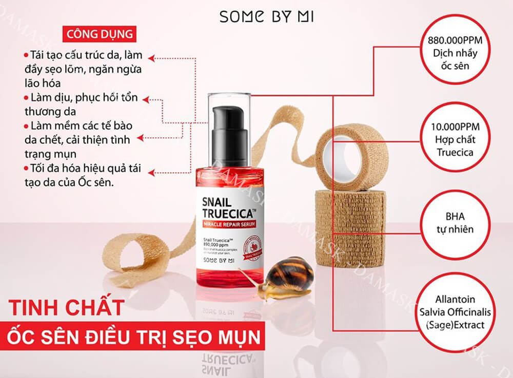 Thành phần chủ yếu là chất nhầy từ ốc sên đen và hợp chất Truecica. Tinh chất nhầy có tác dụng phục hồi và tái tạo những vùng da bị tổn thương. Vì thế những bạn cần phục hồi da bị sẹo rỗ, sẹo lõm thì nên sử dụng để tái tạo, đồng thời hỗ trợ giảm thâm do mụn gây ra.