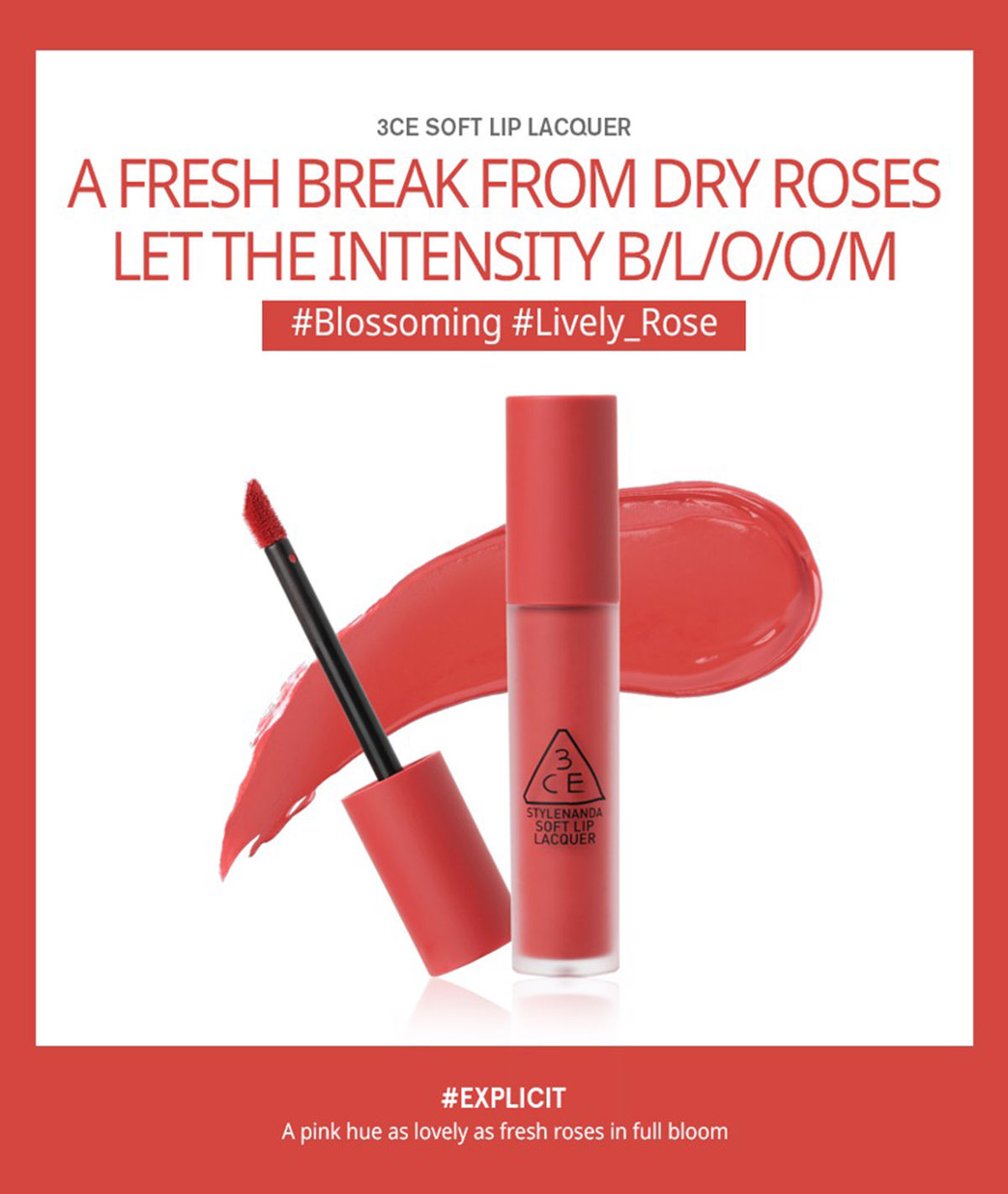 3CE Soft Lip Lacquer không phải son bóng, cũng không phải son lì khô mà là phiên bản nâng cấp của son lì truyền thống: lì vừa phải, có độ trơn mềm nhất định chứ không khô hẳn. Hãng cũng quảng cáo đây là dòng son đầu tiên của hãng mang chất son đặc biệt như vậy.