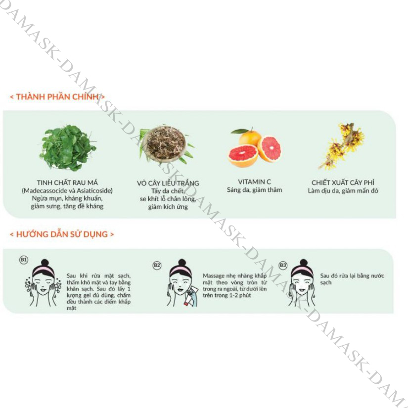 + Chiết xuất rau má tươi Jeju (Madecassocide và Asiaticoside) là những hoạt chất chính giúp cải thiện tình trạng mụn cũng như ngăn ngừa mụn quay trở lại.