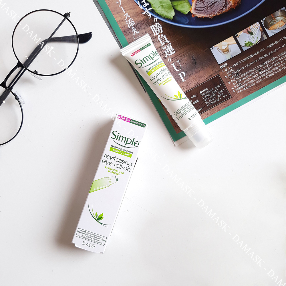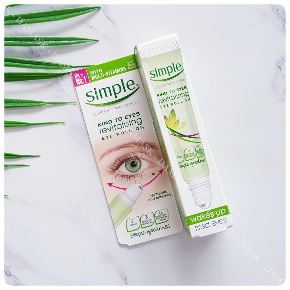 Kem mắt Simple Kind To Eyes Revitalising Eye Roll-On là sản phẩm kem dưỡng mắt nổi tiếng của hãng Simple từ Anh Quốc, với thành phần chính là chiết xuất dưa leo cùng các loại vitamin như Pro-Vitamin B5, B3, Glycerin và Lupin... có tác dụng làm giảm thâm, bọng mắt, xóa tan các dấu hiệu của sự mệt mỏi, cung cấp dưỡng ẩm để chống nhăn vùng da nhạy cảm quanh mắt.