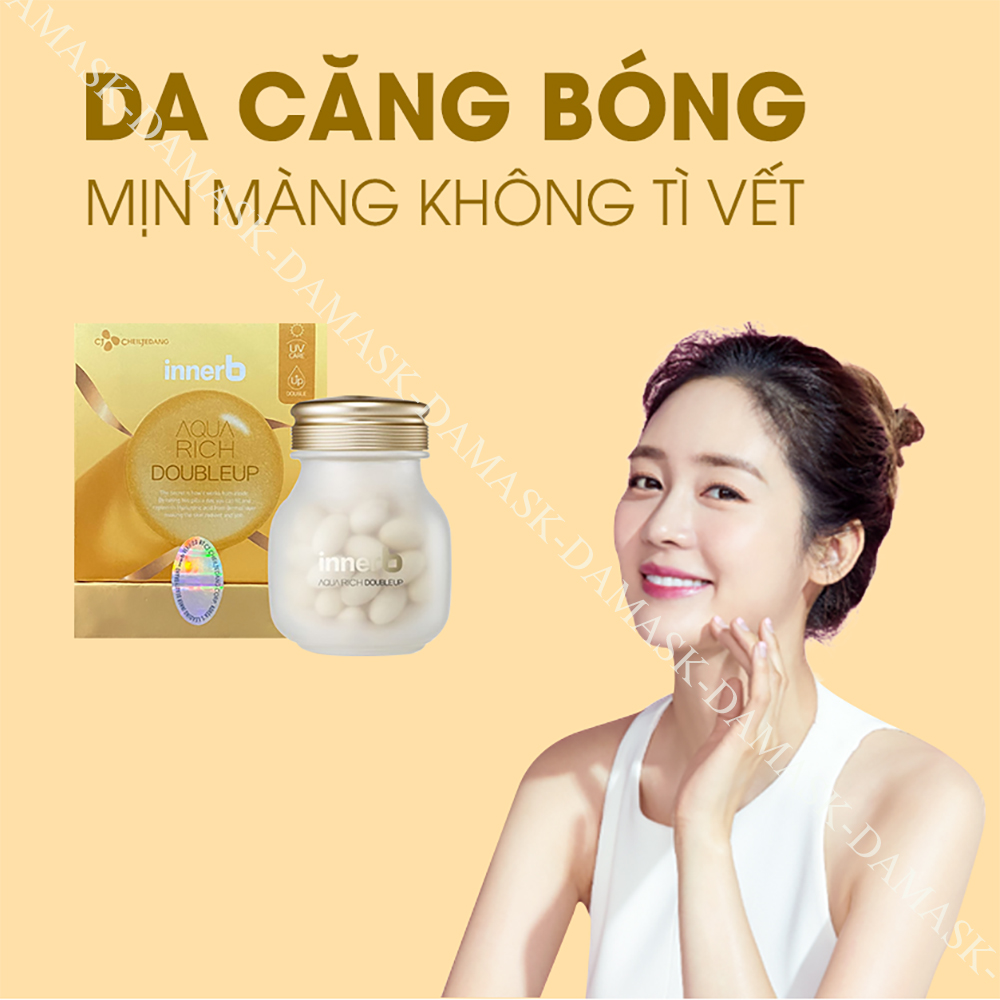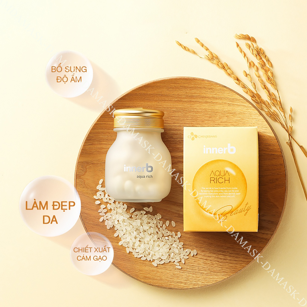 Innerb Aqua Rich là thực phẩm chức năng có dạng viên nang, mềm. Với thành phần chủ yếu gồm hơn 90% Hyaluronic Acid, đây là thành phần cấp ẩm chuyên sâu, chúng ta có thể thấy em ấy trong hầu hết các sản phẩm cấp ẩm cho da. Cùng Collagen làm tăng sự đàn hồi cho da, chống lão hóa. Glucosylceramide làm sáng da và tạo một lớp rào chắn giữ lại độ ẩm cho da.